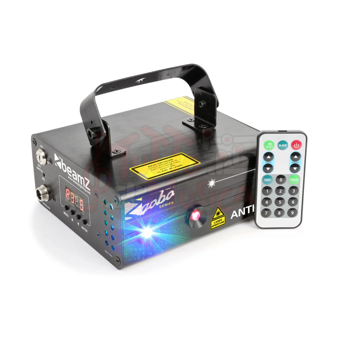 Il Beamz Anthe II Double Laser 600mW RGB Gobo DMX laser può proiettare molti raggi con gobo su qualsiasi parete, soffitto o pista da ballo. Il laser rosso, verde e blu include un telecomando IR per il controllo wireless e per passare da programmi ad attivazione sonora a programmi automatici. In modalità DMX il laser hai anche il controllo totale di tutti i pattern. Ci sono funzioni di sicurezza come un interruttore a chiave e un’interfaccia di interblocco. Il design leggero della custodia lo rende ideale per intrattenitori mobili, gruppi musicali, night club