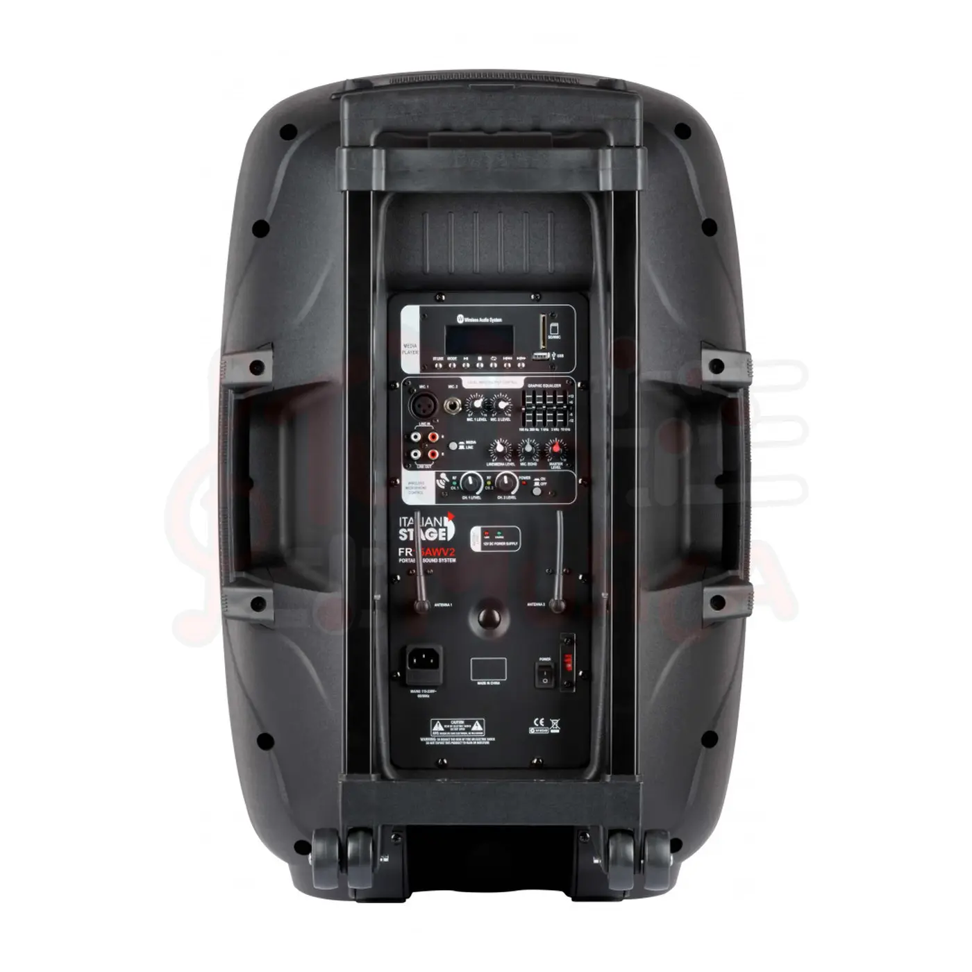 NUOVO Diffusore Italian Stage IS FR15AWV2 portabile a batteria in PP 15’’ con MP3 player, SD card, USB, Bluetooth, Telecomando IR. – 2 Radiomicrofoni UHF(863/865 Mhz). – Woofer 15’’. – Driver 1’’. – Potenza RMS 100W Class D. – Picco 200W. – EQ grafico a 5 bande. – Risposta in frequenza 38hz-18khz
