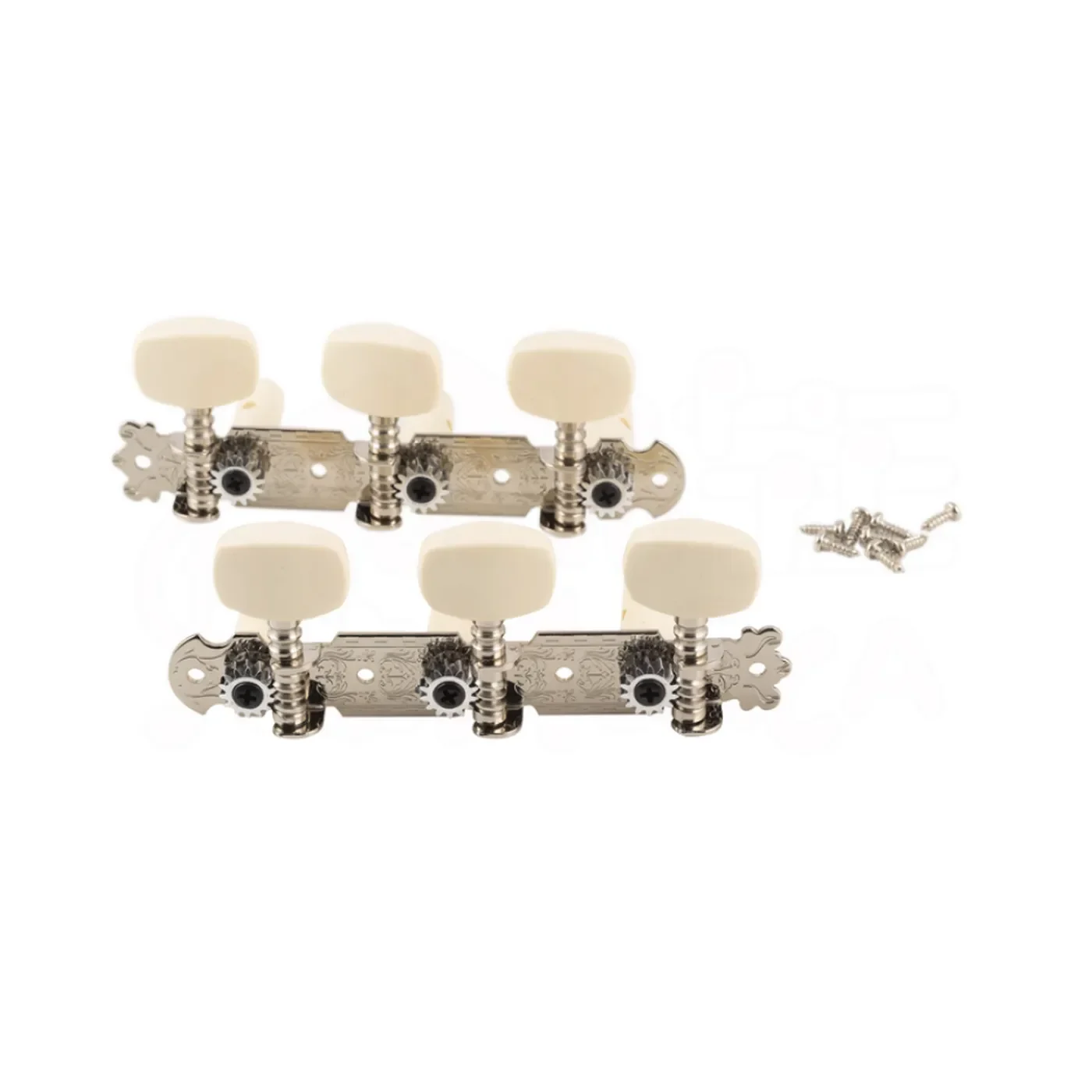 Meccaniche per chitarra cromate. Allineate 3 a destra e 3 a sinistra.